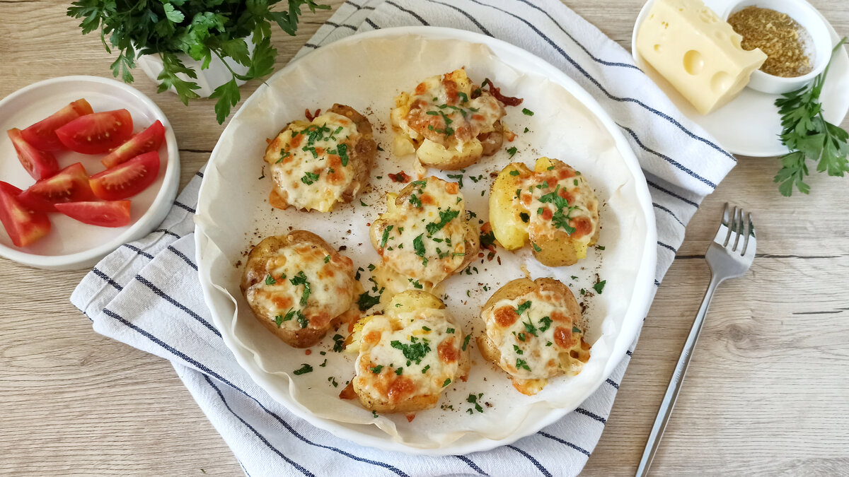 - Мятая картошка в духовке: картофель, чеснок, сыр, масло.