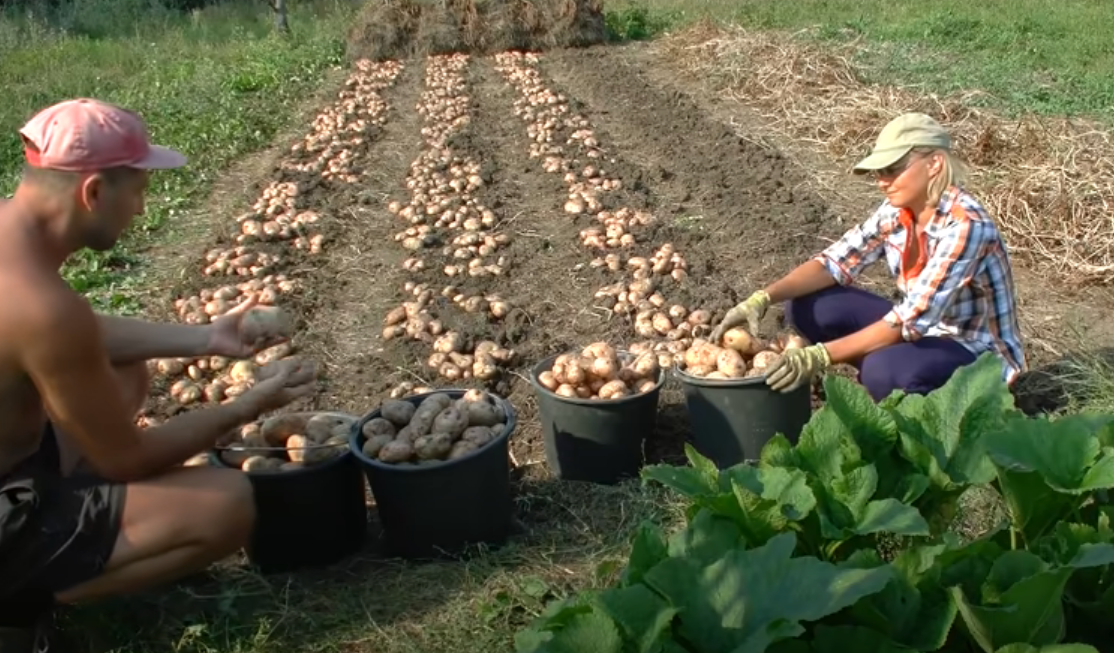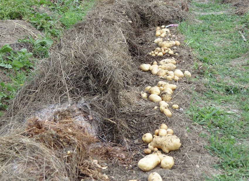- Посадка под солому: картофель закладывается на расстоянии 30-40 см от поверхности, а сверху засыпается соломой.