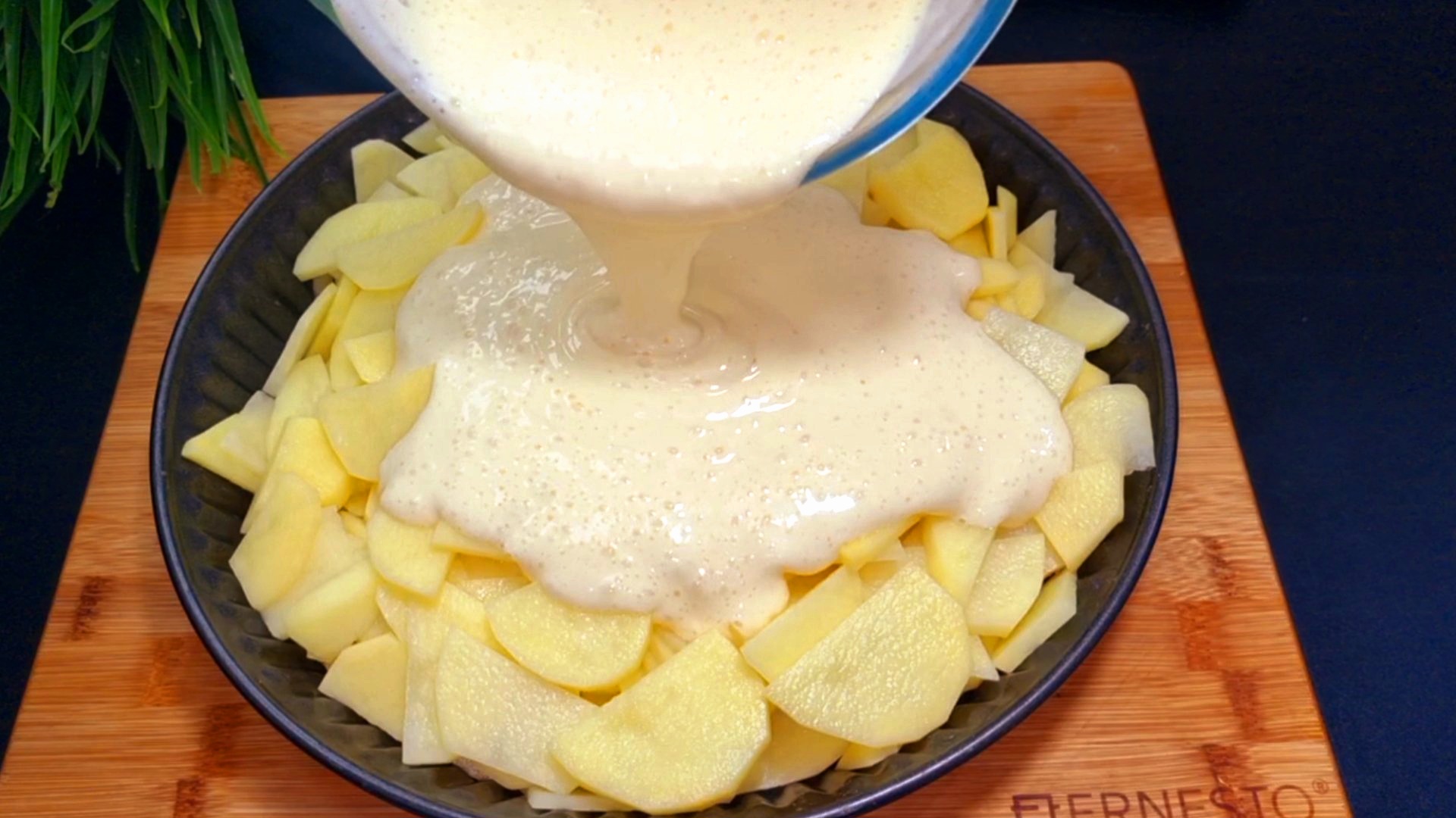 "Вкусный ужин на скорую руку! Картошку залейте стаканом кефиром и поставьте в духовку. Шаги по приготовлению: