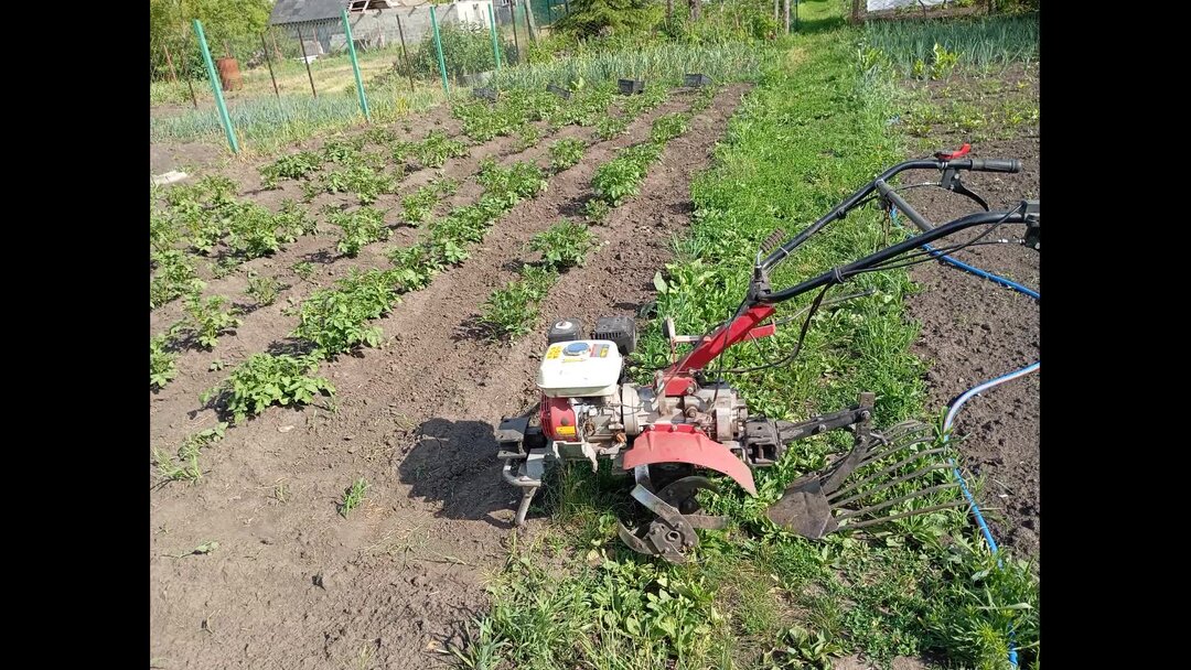 - Мотокультиватор: этот инструмент позволяет окучивать картофель на глубину до 20 см.