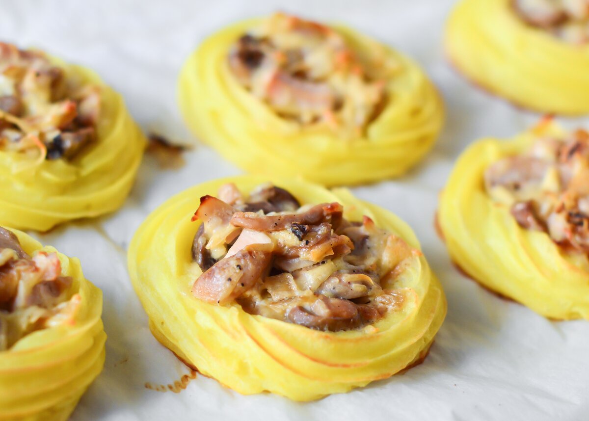 Once the potato is cooked, use it to form nests or "gnezda" on a baking sheet. Fill each nest with the prepared filling and top with grated cheese. Bake in the oven until the cheese is melted and bubbly.