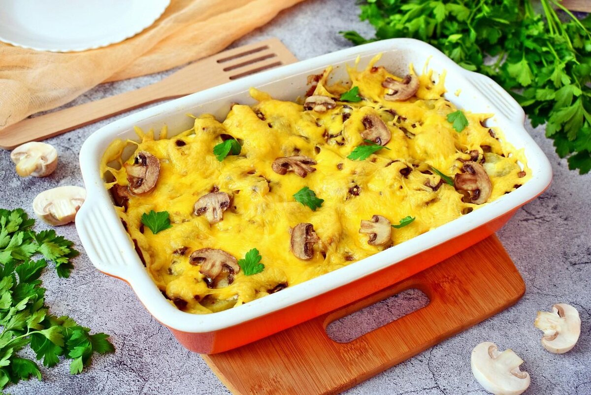 После приготовления грибной начинки, вы можете начать собирать картофельное блюдо. Для этого вам нужно сложить обжаренные ломтики картофеля в форму, а затем добавить грибную начинку и сыр.