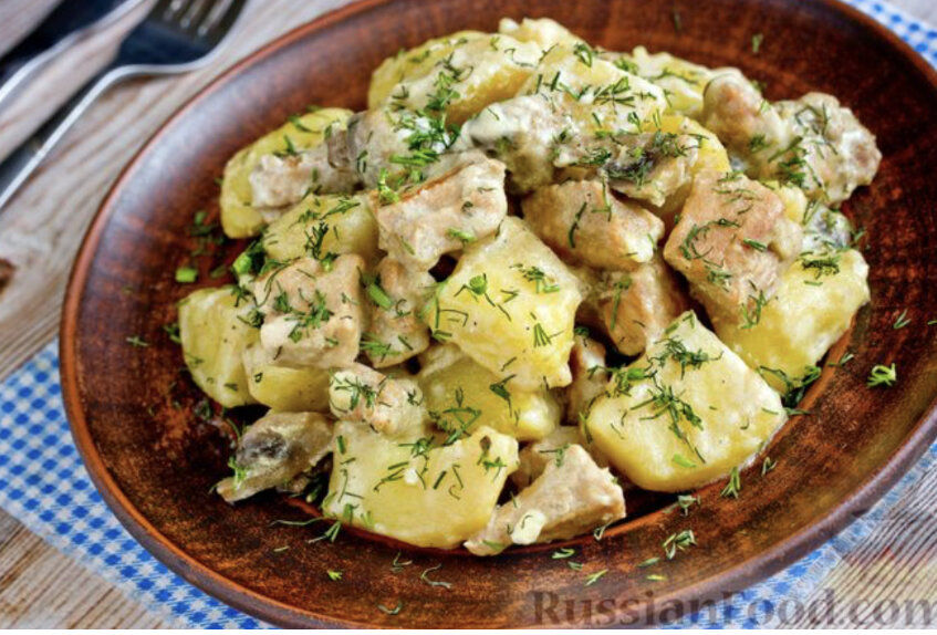 - Картошка с грибами и мясом на сковороде: добавьте нарезанное мясо (например, свинина или говядина) к картофелю и грибам.