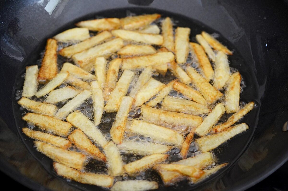 - Удалите картофель фри из сковороды и переложите его на бумажное полотенце, чтобы избавиться от лишнего масла.
