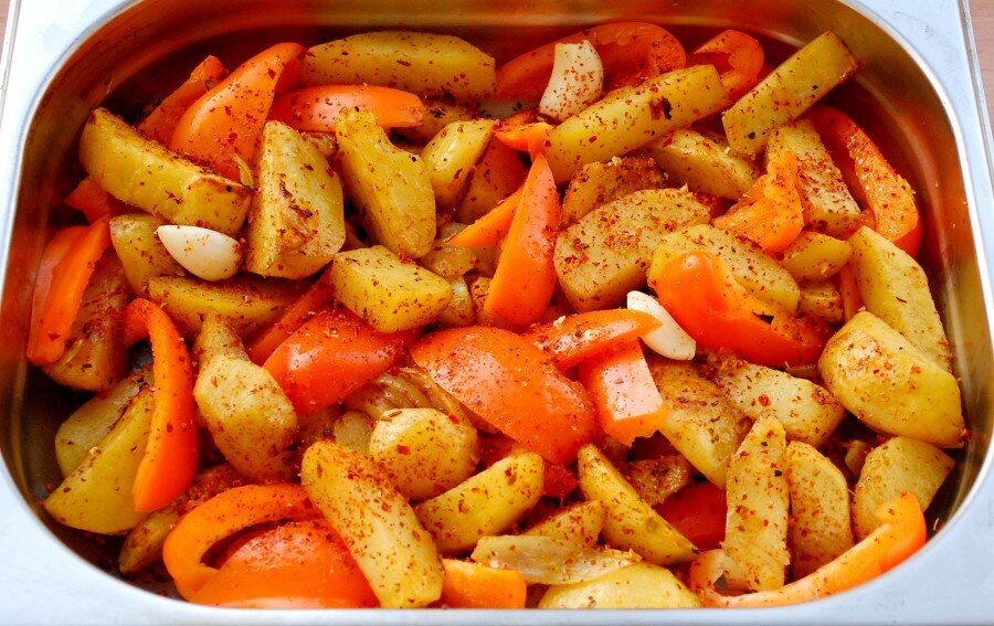 Все рецепты готовятся по одному и тому же принципу. Картофель нарезается на кусочки, лук – на кольца, помидоры – на дольки. Затем все ингредиенты выкладываются в форму для запекания, смазанную оливковым маслом, и отправляются в духовку на 30-40 минут.
