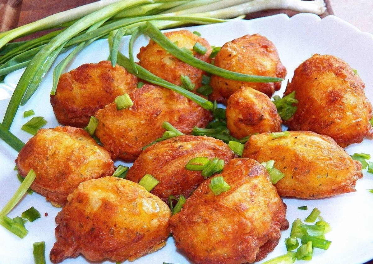 Картофельные шарики во фритюре: смешайте муку, яйца, соль и сахар, добавьте нарезанный картофель и воду. Обжарьте в фритюрнице до золотистого цвета.