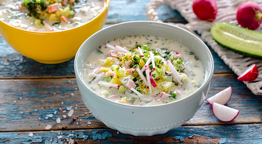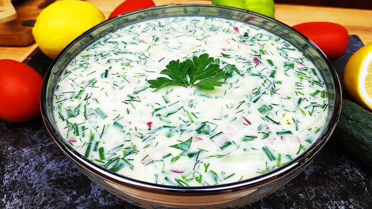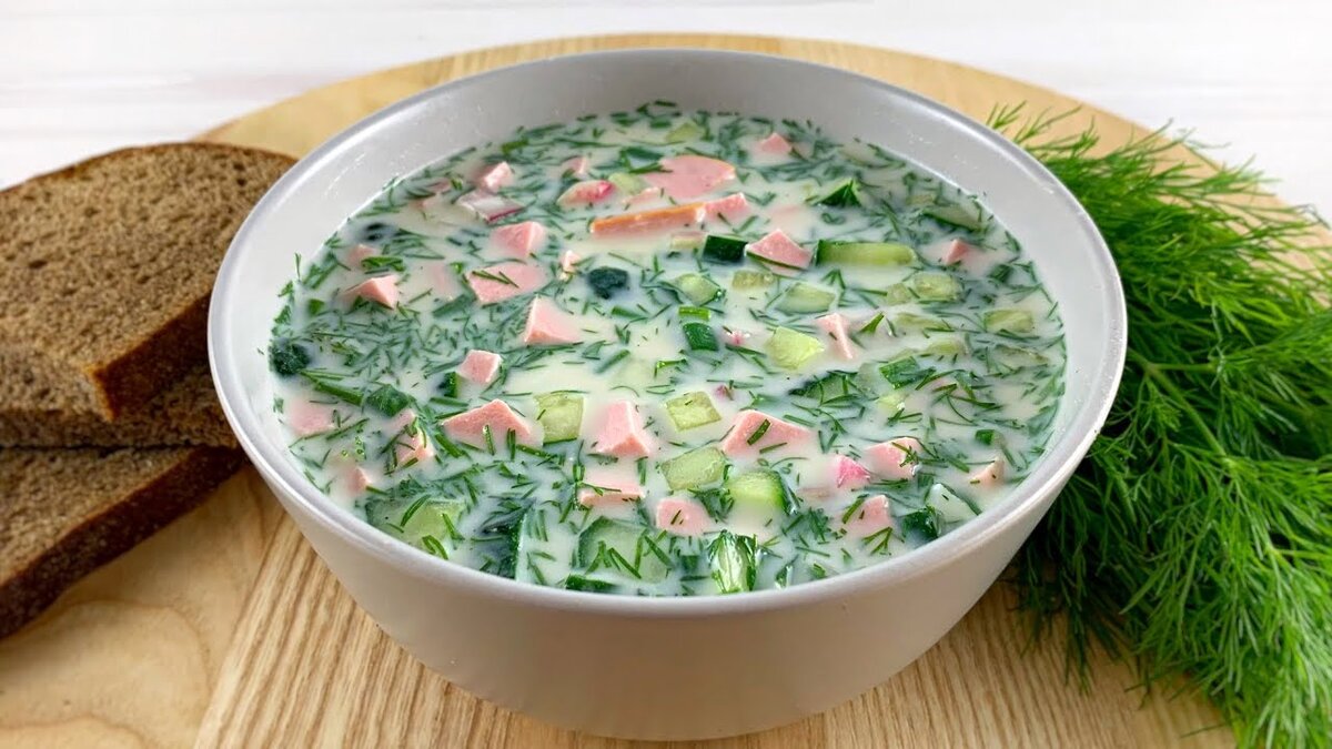 Для приготовления этого блюда вам потребуется минеральная вода, кефир, хлеб, лук, огурцы, картофель, колбаса и зелень. Все ингредиенты смешайте в глубокой миске, добавьте соль и перец по вкусу, а затем дайте супу постоять около 10 минут.
