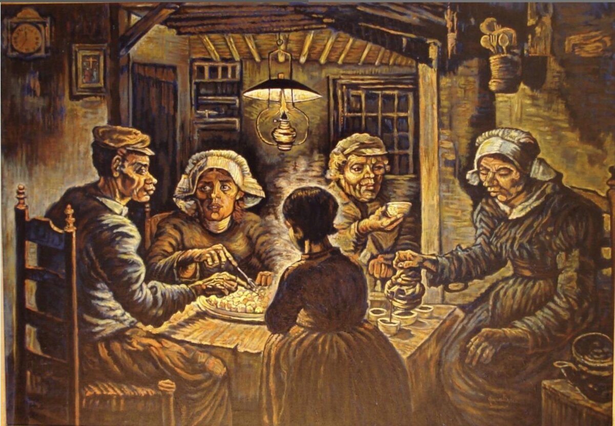 Вот, когда я смотрел на картину Винсента ван Гога "Едоки картофеля", я не мог отвести глаз от ее простых и одновременно сложных форм. Картофель - это символ жизни, а также смерть, потому что он может быть пожран и исчезнуть в один момент. Аналогично и жизнь человека - она может быть короткой или длинной, но всегда имеет свойство изменяться.