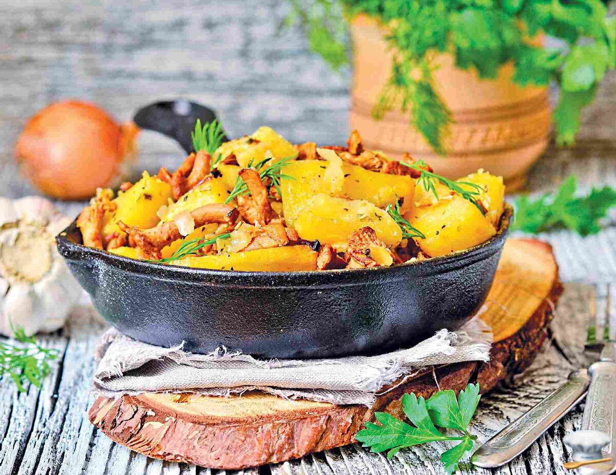 - Картошка с грибами: обжарьте нарезанный картофель на сковороде с добавлением масляной смеси и добавьте нарезанные грибы.