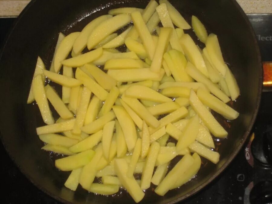Начните с обжарки картофеля в масле до тех пор, пока он не станет золотистым. Затем добавьте соль и перец, и продолжайте готовить несколько минут.