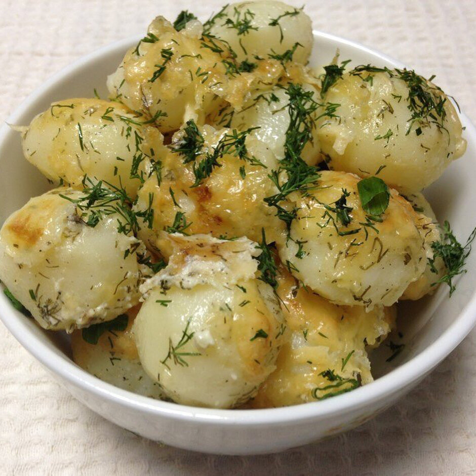 После того, как картофель будет готов, его нужно достать из духовки и остудить до комнатной температуры. Затем нужно нарезать картофель кубиками и смешать с 2 столовыми ложками сметаны и 1 столовой ложкой тертого сыра.