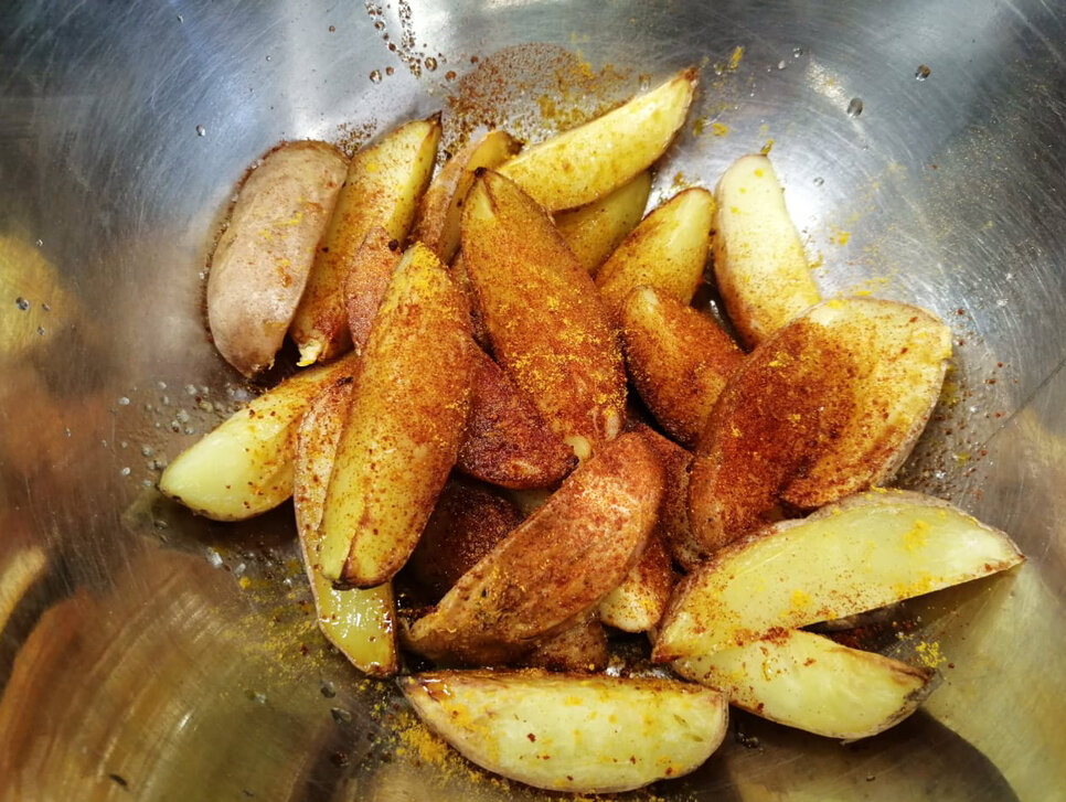 - Добавить нарезанный картофель к маслу и перемешать до равномерного покрытия.
