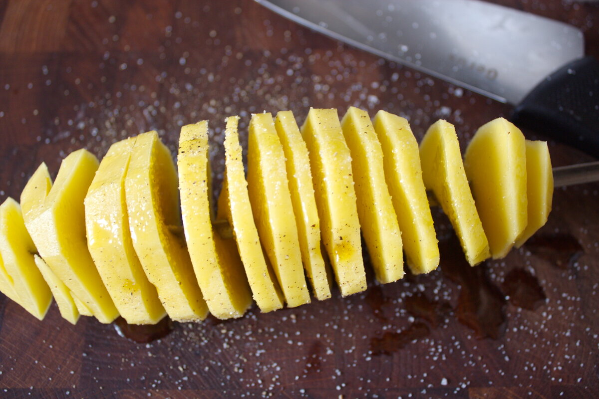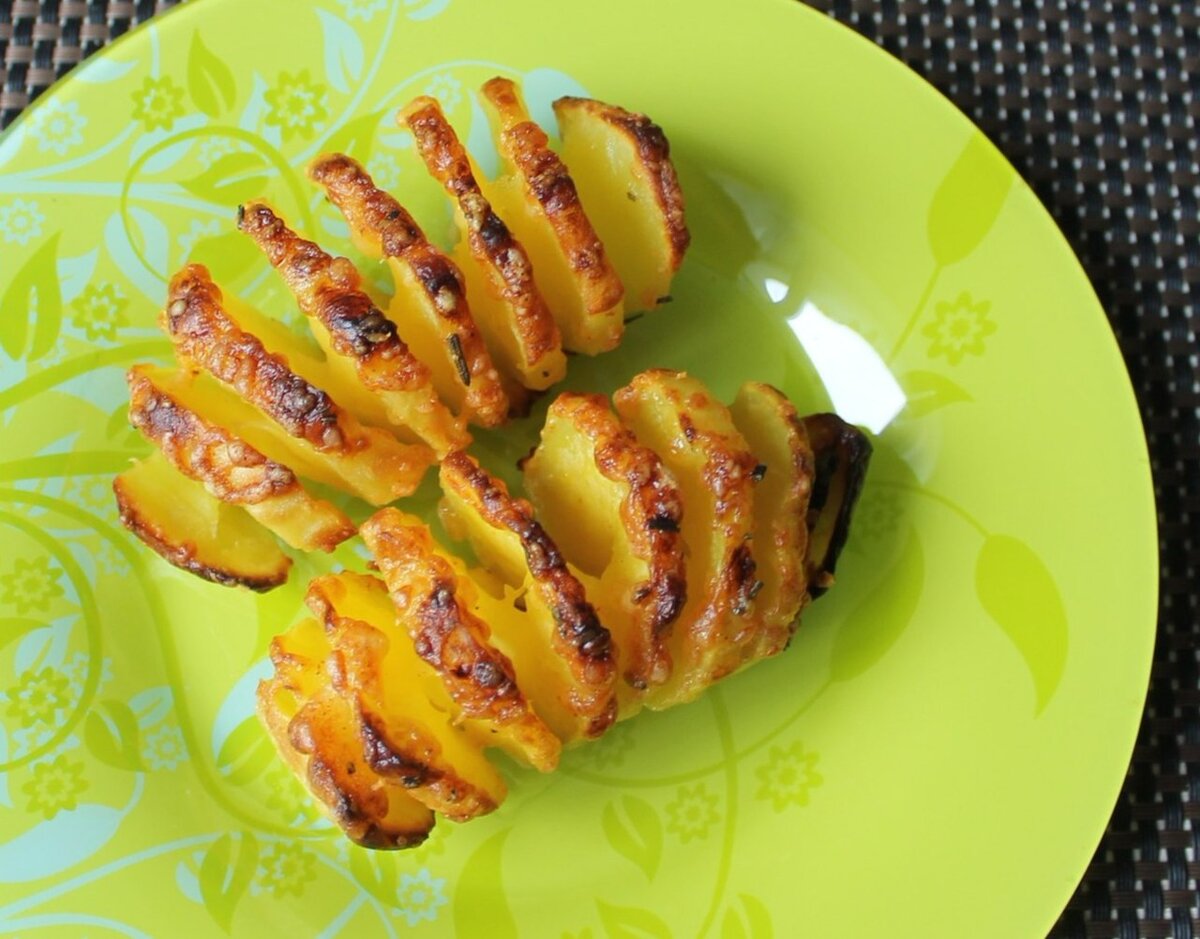 - Винтовой картофель в духовке: нарезать картофель спиралью, положить на шпажки и запечь в духовке.