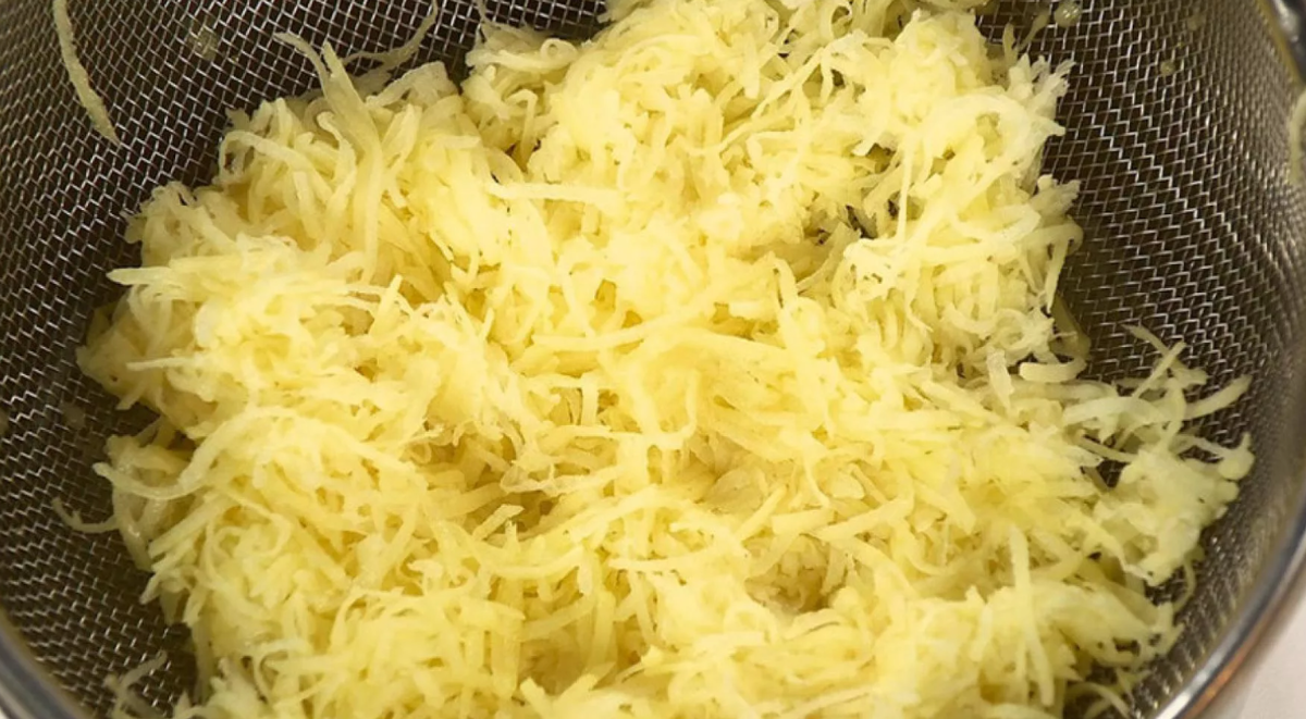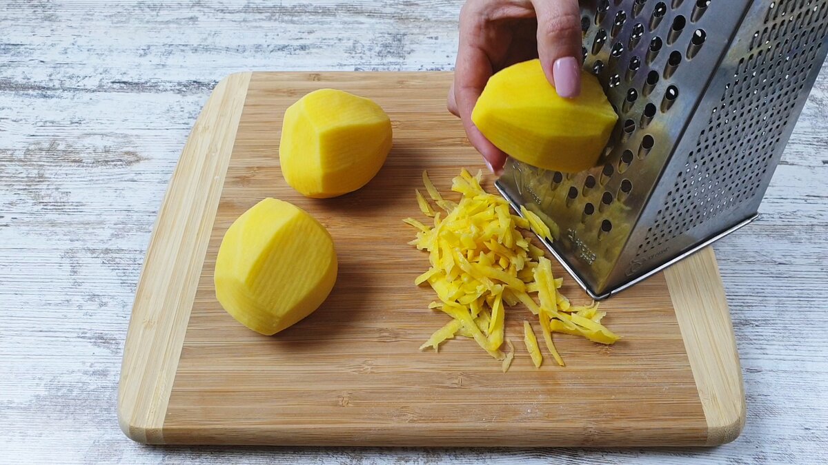 Картофель нужно отварить в мундире, а затем остудить до комнатной температуры. Только после этого можно начать натирать его на терке или мясорубке.