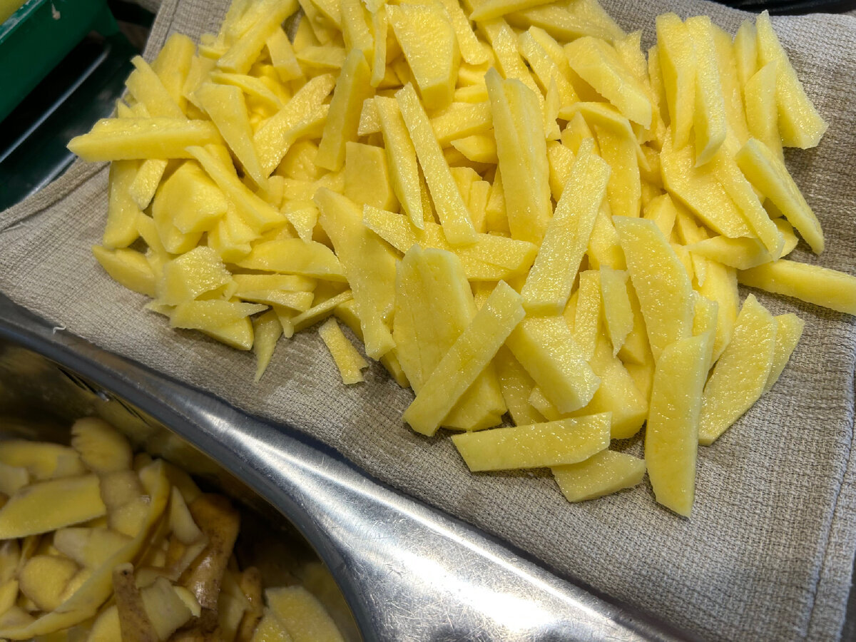 Далее, мы будем резать картофель соломкой. Для этого, снимите кожуру с картофеля и нарежьте его на длинные тонкие полоски.