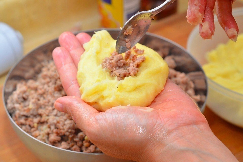 Варите картофельные зразы с мясным фаршем в домашних условиях, следуя пошаговому рецепту, который представлен ниже: