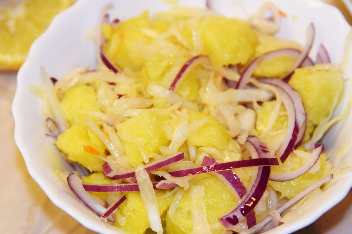 - В миске смешайте вареный картофель, нарезанный лук, соленые огурцы, майонез, соль и перец.