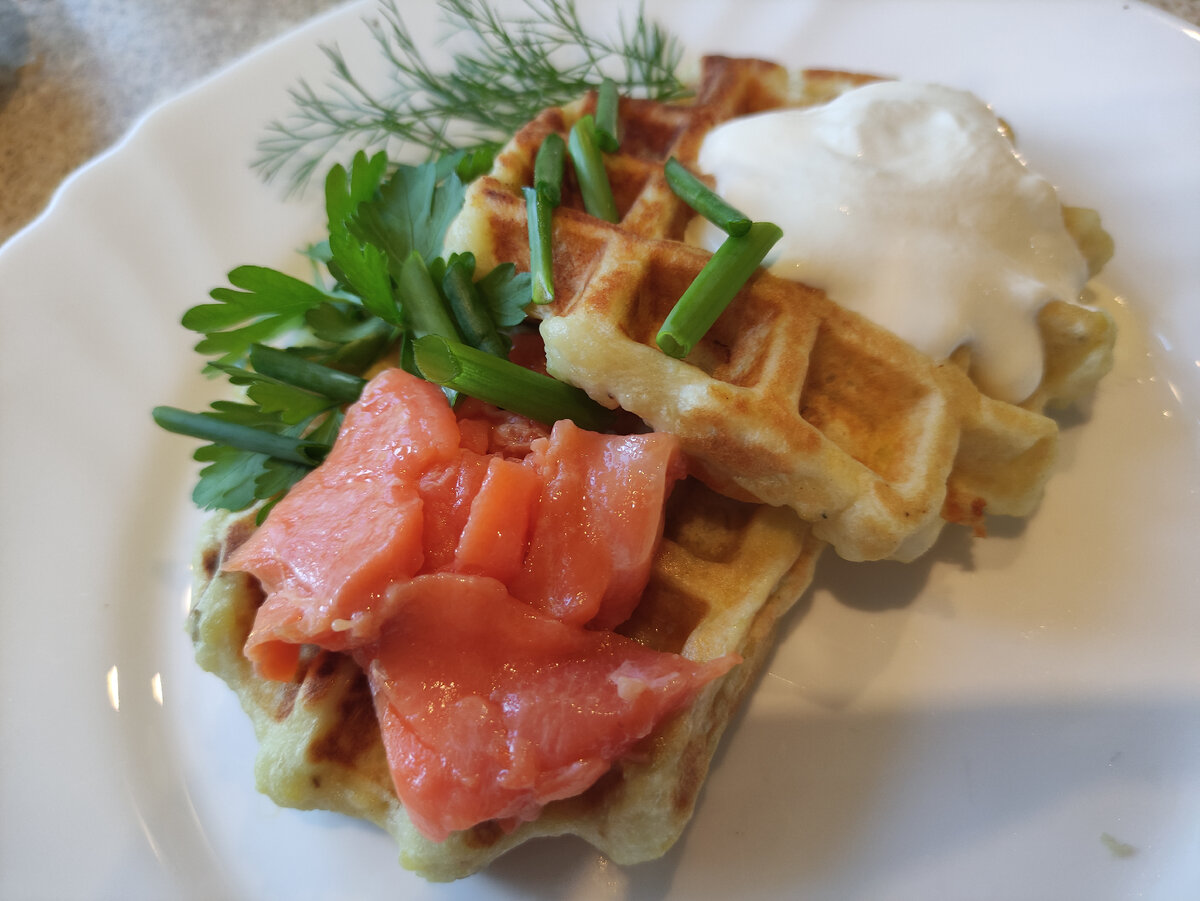 Вафли готовы! Они могут быть поданы с хрустящим беконом, яйцом пашот и сливочным соусом.