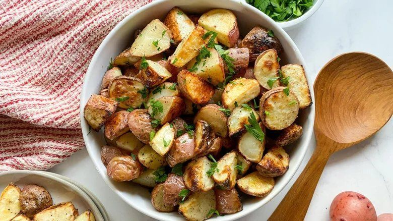 Красный картофель может быть также использован для приготовления различных гарниров. Например, вы можете приготовить гарнир из красного картофеля и зелени. Для этого вам нужно нарезать картофель на кубики и зеленую часть лука на тонкие полоски. Затем смешайте все ингредиенты вместе с добавлением оливкового масла и винной кислоты.
